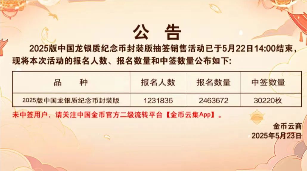 今天,金币云商正式公布了中国龙纪念币封装版的中签结果。此次共有 123 万人次报名,报名数量约 246 万枚,最终中签数量为 30220 枚。