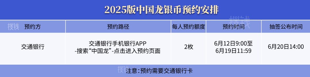交通银行中国龙银币预约通道,截止至 19 日 11:59 分,每人可预约 2 枚,中签结果将于 6 月 20 日 14 点公布。