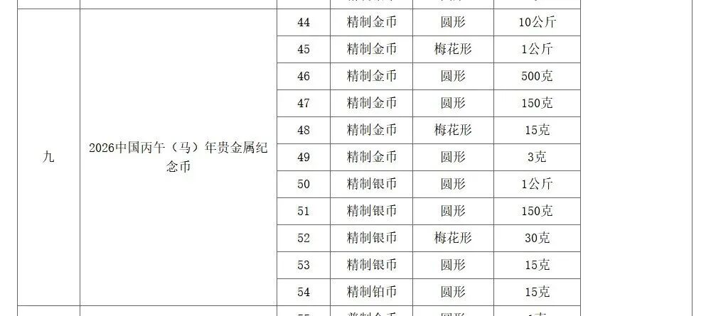 8.马年贵金属纪念币发行11个品种,减少2公斤圆形金币规格