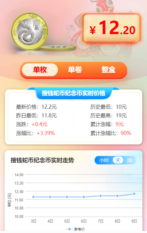 市场表现最亮眼的除了龙虎兔三枚外,牛币、猪币、蛇币等品种也有不同程度上涨,蛇年纪念币价格上涨至12.2元。牛币涨至12元、猪币涨至11.8元。