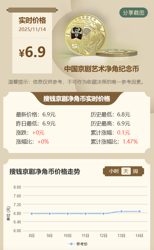 京剧三组净角币期货热度较低,期货价在6.8元左右,而黑金净卡因发行量低于10万枚,期货价达50元。(点击下方图片,进入搜钱小程序,查看更多纪念币钞实时行情。)