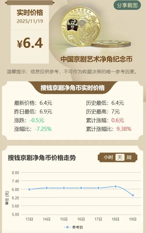 目前京剧净角币单枚报价跌至6.4元,整卷跌至 128元左右,整盒跌至650元左右。