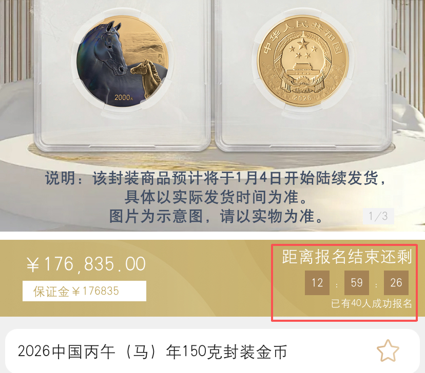 2026 年马年金银纪念币封装版金币云商预约抽签进入倒计时,截止时间为今日中午 12 点,目前各品种参与热度呈现明显分化。
