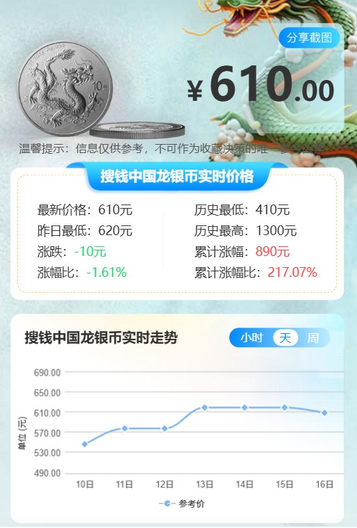 龙银币裸币稳定在610 元左右