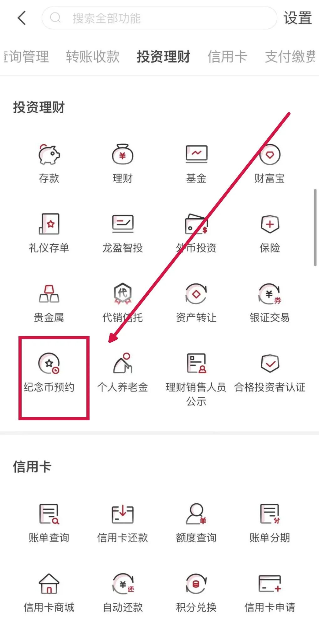 点击首页 “全部”,—“投资理财” 栏— “纪念币预约”。