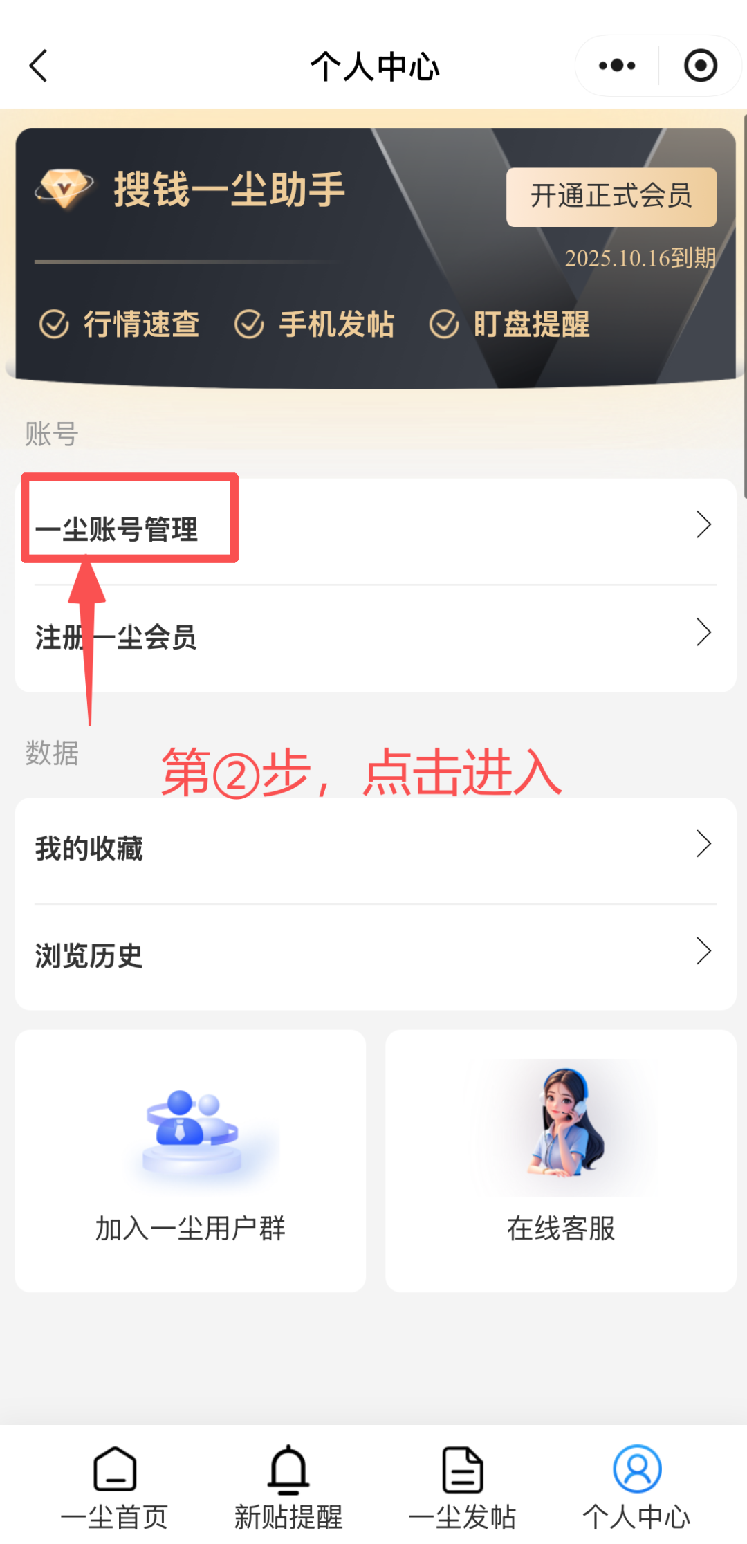 在首页找到「个人中心」,点击「一尘账户管理」进入。