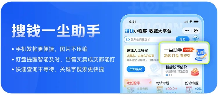 搜钱网是北京搜钱网络技术有限公司研发,致力于为钱币收藏爱好者打造了一个安全、便捷、专业的交流交易空间。用户可以通过微信小程序使用“搜钱”小程序 ,可向用户提供钱币藏品免费发布,智能估价、藏品人工在线鉴定、钱币百科,龙钞蛇钞配号等服务,通过技术与文化的深度融合,搜钱小程序以数据驱动、安全透明、用户共创为核心,重新定义生肖纪念钞的收藏与交易体验,助力每一位用户实现藏品价值的最大化释放。现注册用户超520万。
