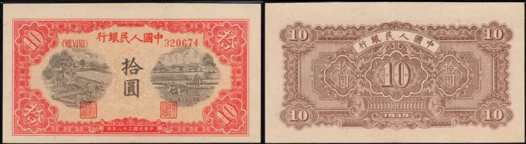10元锯木犁田,PMG 55EPQ,大开门原票,超大宽边,墨色很是鲜亮,号码是乱蛇趣味号,在9月中旬的成交价4992元。