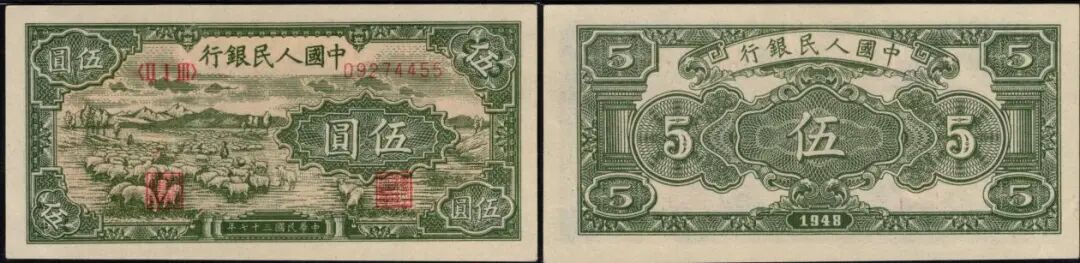 5元小绵羊,小热门品种,美评PMG58EPQ,全新原票,纸张纹理不错,双尾4455,在9月中旬群里成交价到5200元。