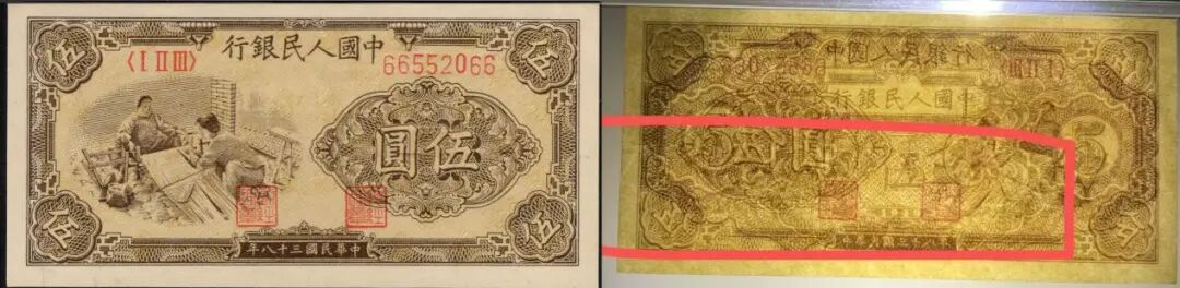 5元织布,稀少英文水印版,美评PMG65E,亚军分,中部偏下方英文水印横贯纸张,号码为无347双尾66靓号,在9月中曾拍出26000元;其普通版式,美评64E,成交价到4160元。