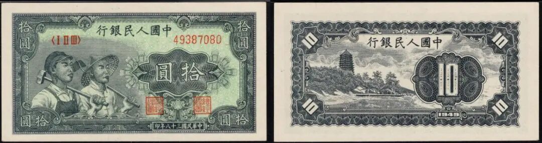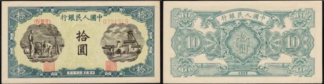 10元灌田与矿井,三大首发人民币之一,此枚美评PMG 58EPQ,全新原票,底纹鲜亮深重,对光未见黑线,在9月中的成交价到14040元。
