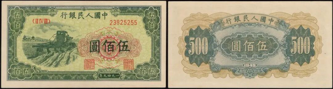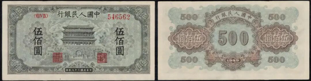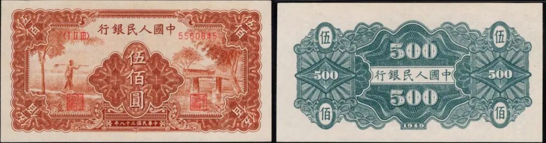 500元农民与小桥,美评PMG55分,无背标,9月中旬成交价为7072元;美评58分,无背标,豹子号111,成交价到11440元。