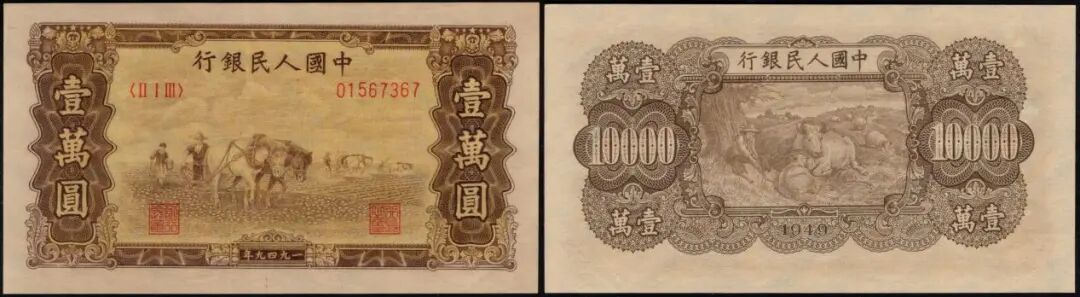 10000元双马耕地,角水印版,美评PMG55E,边际宽大,状态极为不错,在9月中旬群里的成交价到11440元;其同分,号码无47,价格到14000多。