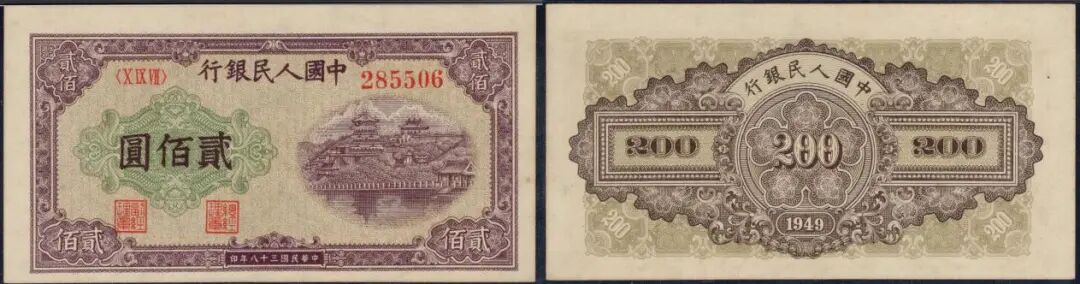 200元排云殿星水印版,美评PMG 63分,无背标,大开门原票,号码无347,老壳子票子,9月中旬的成交价为9360元。