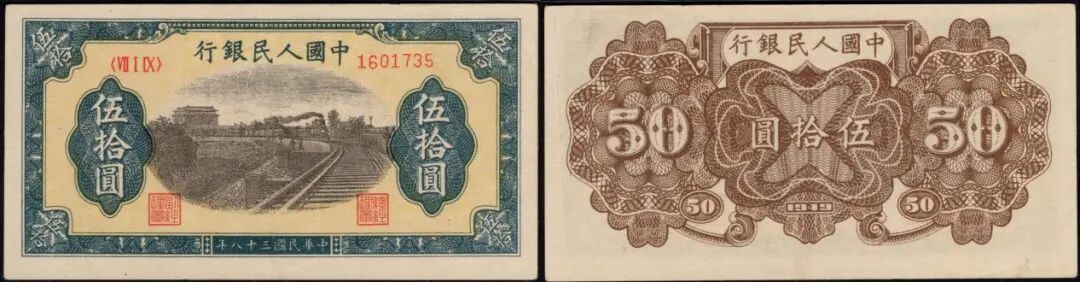 50元铁路与列车,七位码,美评PMG 55E,带As Made Wrinkle背标,“原始皱痕,自然原票,在9月中旬曾拍出7280元。