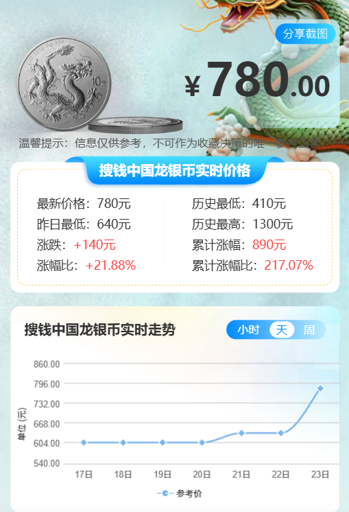 龙银币裸币上涨至780 元左右