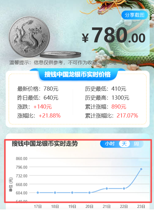 目前龙银币裸币价格已达到780~790元左右,智能卡两枚套装更是涨至1400元左右。市场行情火热,新币预约更要抓紧。