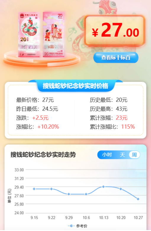 龙年纪念钞通货:78元蛇年纪念钞通货:26元马年纪念钞通货(期货):35.5元马年纪念币(期货):14.1元二龙币单枚:19.8元二蛇币单枚:11.8元京剧艺术纪念币(生角币):11.4元京剧艺术纪念...