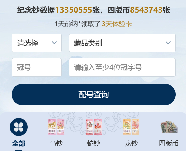 现在有了更专业的解决方案——「搜钱配号助手」。龙蛇马钞、四版币配号神器,能帮你快速配号,坐享升值!