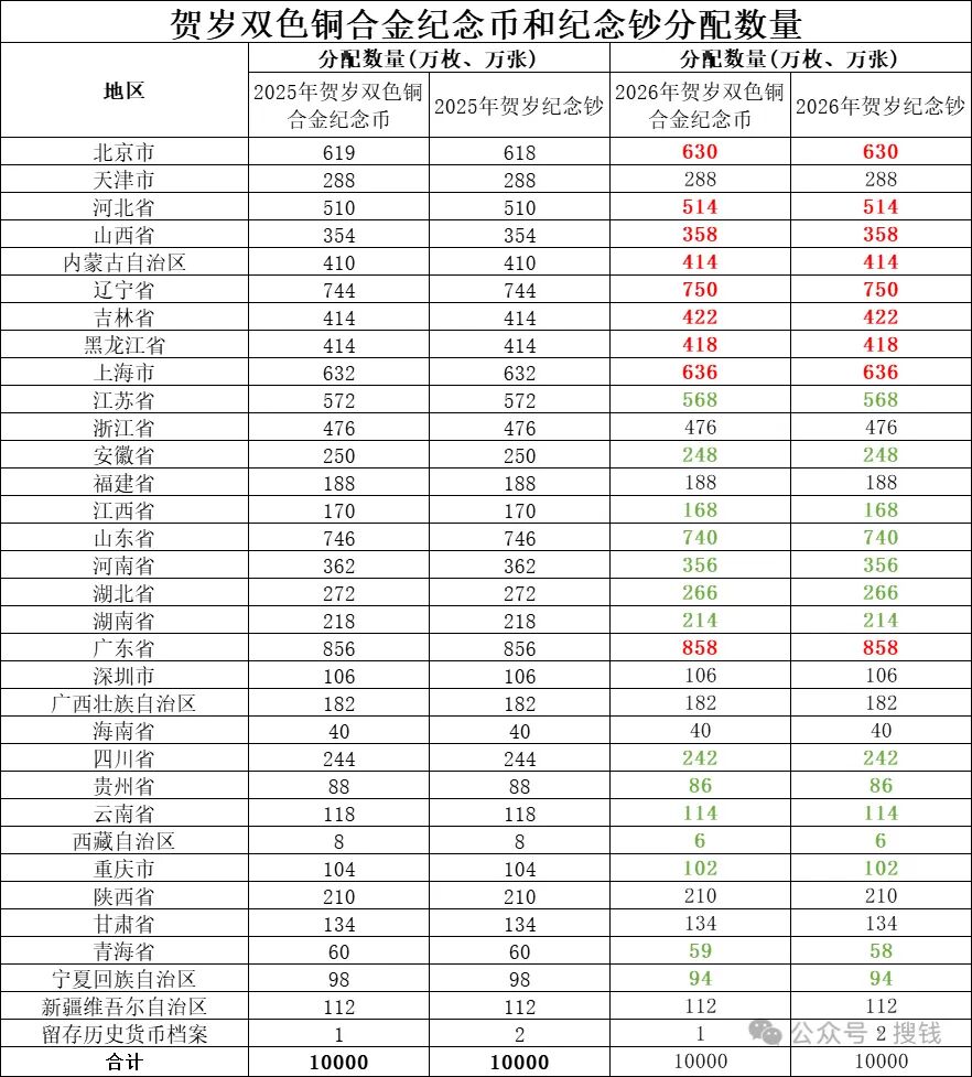 马年纪念币与纪念钞全国各地区分配数量存在明显差异,预约难度呈现区域分化:北京、上海、天津三地分配总量最多,结合常住人口测算基础预约难度相对较低;云南、贵州、四川三地因分配额度偏少,预约难度较大;重庆、福建、深圳等地百人分配数量较少,预约竞争同样激烈。