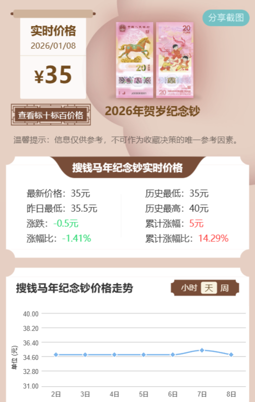 马年普通纪念币期货价稳定在14.3元左右,马年纪念钞行情略有涨幅,最新报价约35元,整体市场期货走势平稳,未出现大幅波动。