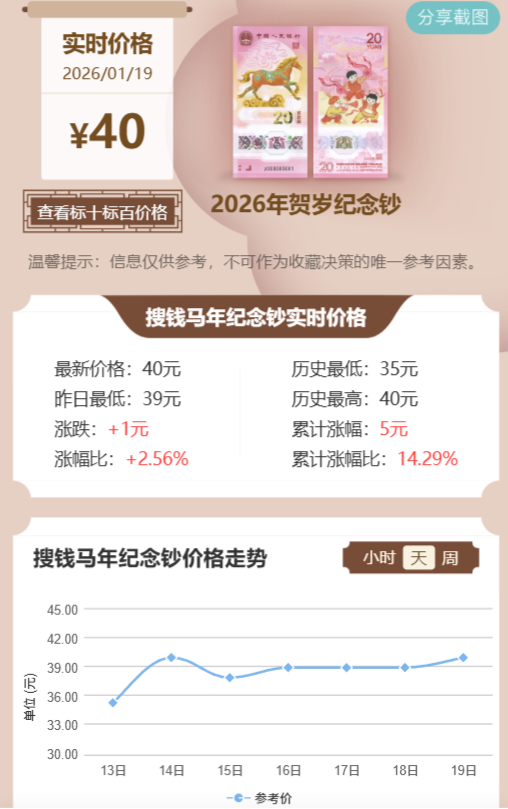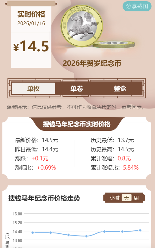 二轮马年纪念币稳定在14.5元左右