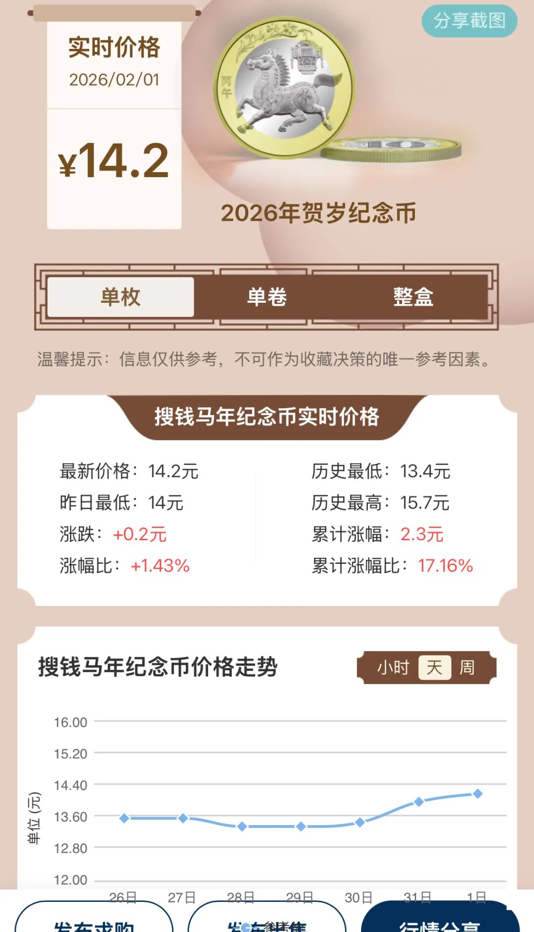 市场数据显示,马年纪念钞(马钞)大宗交易收购价从30元低位回升至31.5元,标十价格稳定在320元。马年纪念币(马币)价格亦从13.2元反弹至14.2元左右。