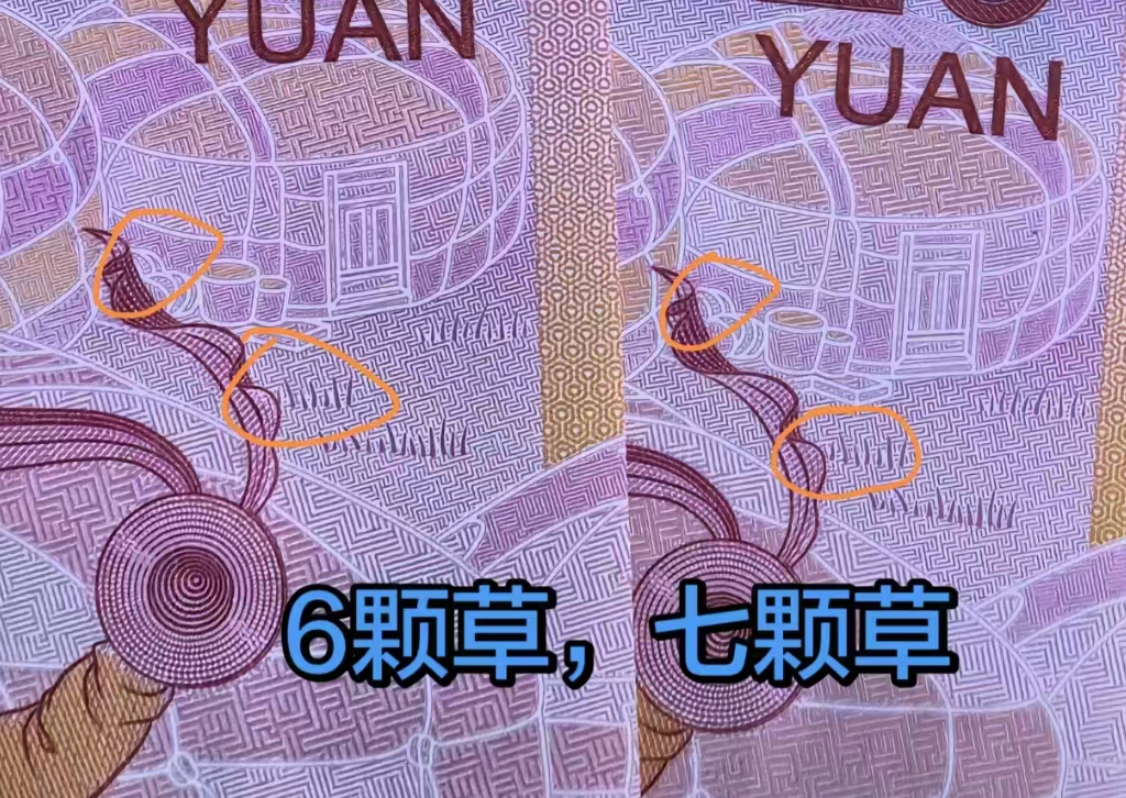 仔细观察马钞上丝带旁边的草丛图案,有的钞上是6颗草,有的是7颗草。这个小差异需要仔细看才能发现。