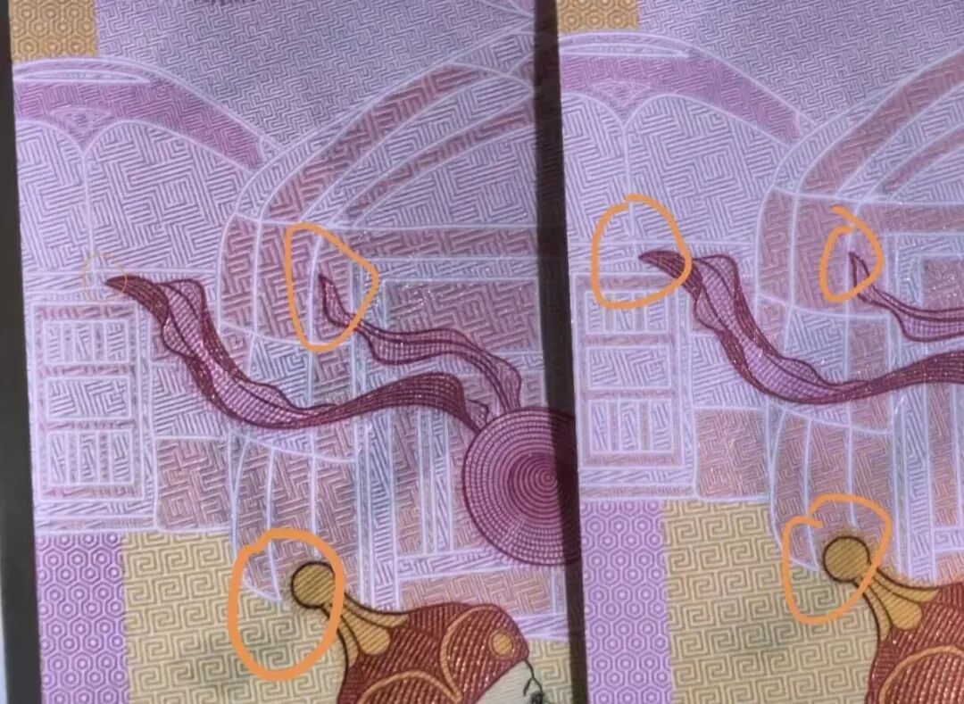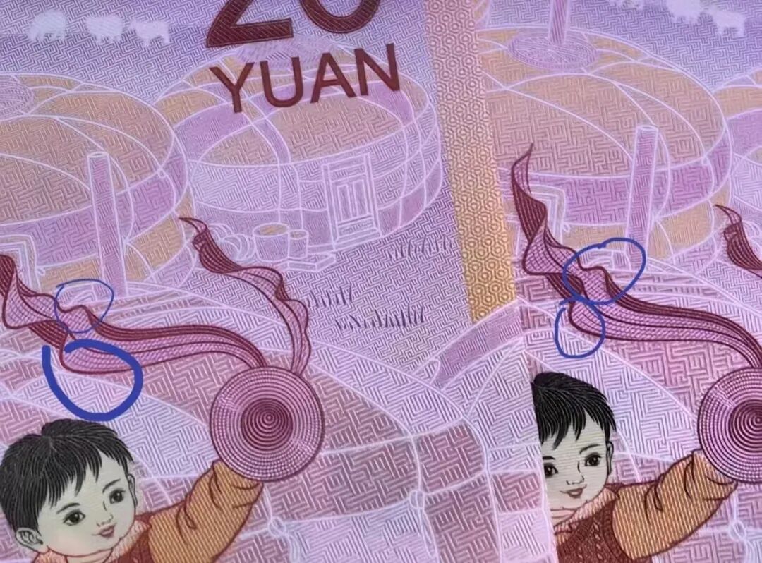 图案中飘带与旁边小孩帽子的相对位置,在不同钞上也有细微差别,有的离得远些,有的靠得近些。