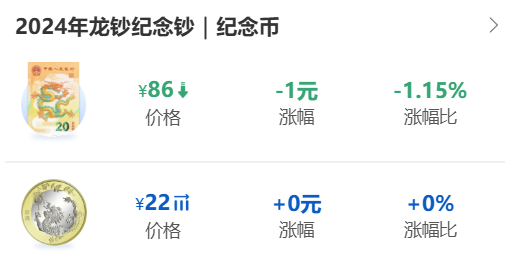 二轮生肖龙年纪念币下跌至22左右