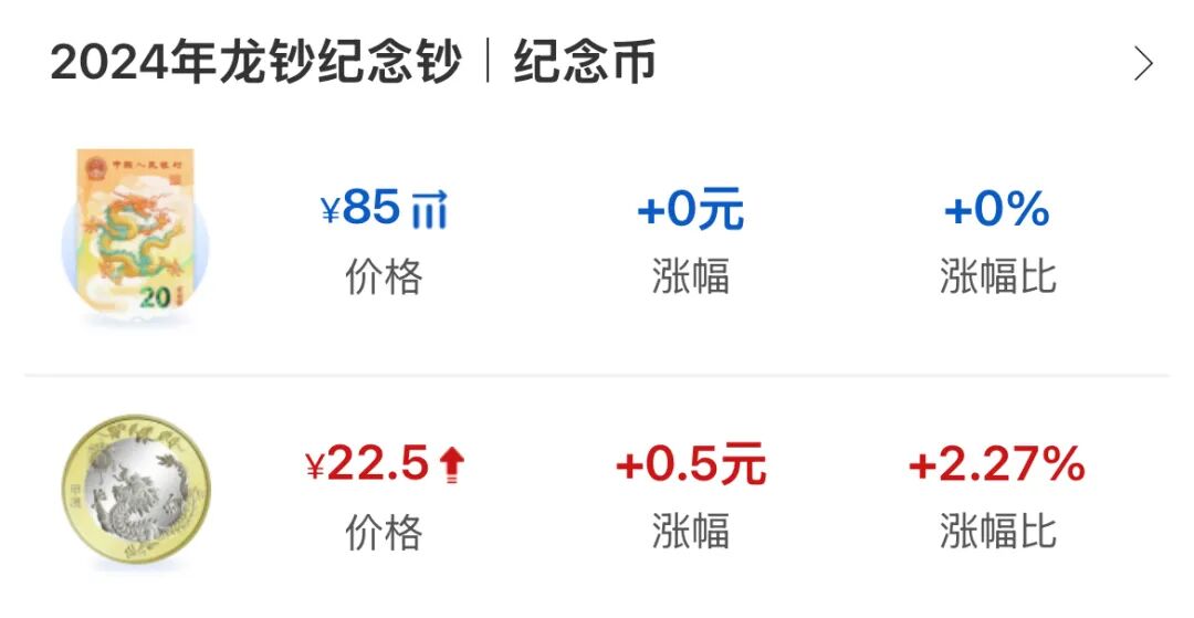 二轮生肖龙年纪念币稳定在22.5左右