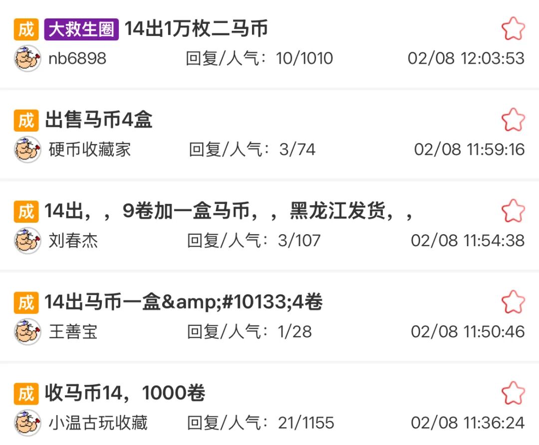 二轮马年纪念币稳定在14元左右