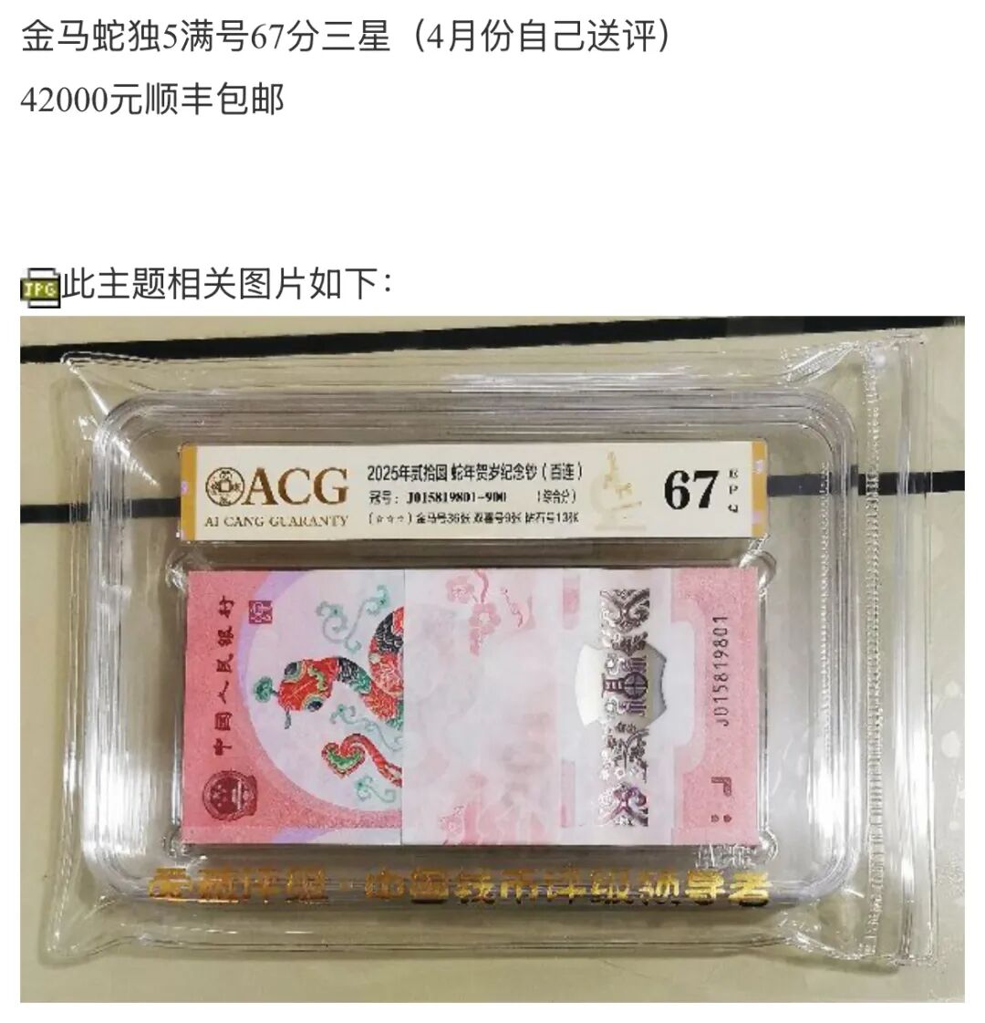 马年纪念钞细分品种表现活跃。一枚爱藏评级67分的“金马刀关羽刀”在某直播间拍出2.53万元价格。同时,无三四七号码的单张马钞价格已达110元左右,马三、马四及带5号码的钞种逐渐成为市场热点。
