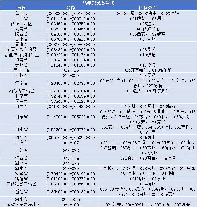 全国各地的马钞号段分布基本确定了,大家可以根据上表看看自己所在地区的号段情况。