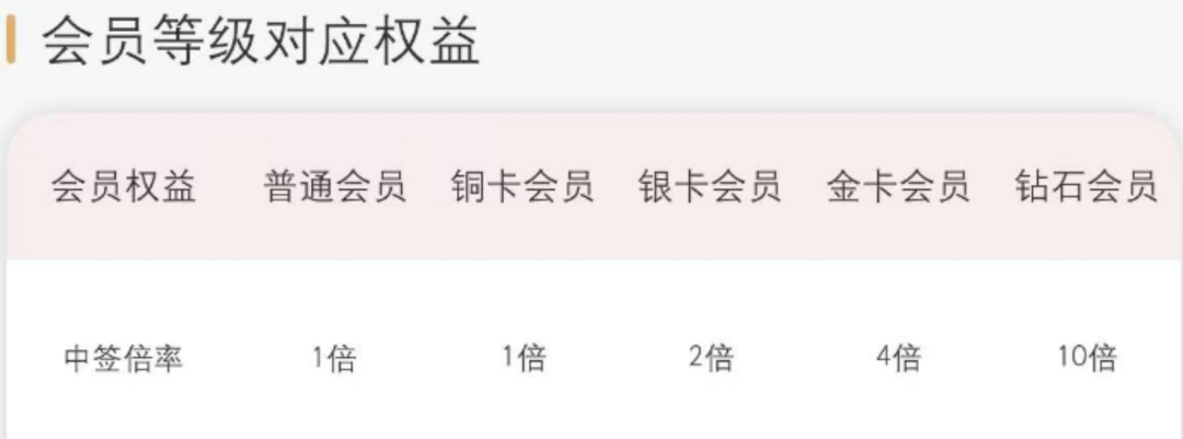 最高等级会员的中签倍率是普通会员的10倍。