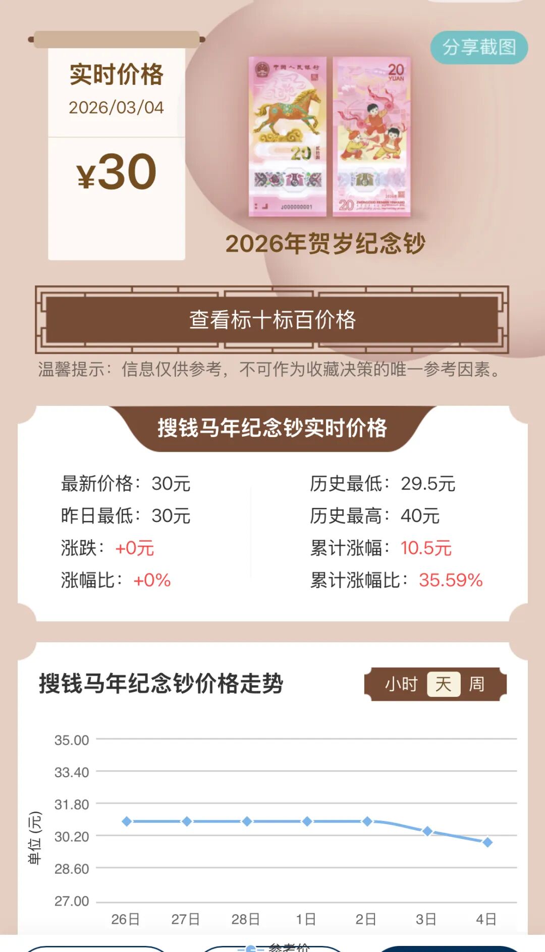 2026年马年纪念钞近期市场行情持续走低,通货不挑号散张价格已跌至30元左右,目前大宗成交价跌至29-30元。
