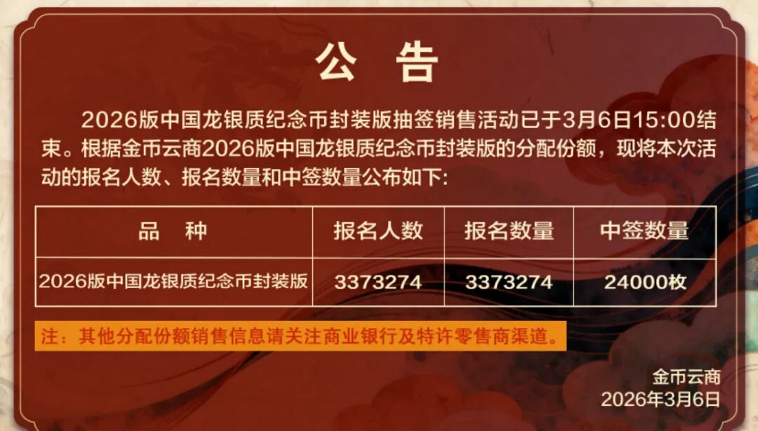 3月6日15时,2026版中国龙纪念币金总封装版预约抽签正式截止。金币云商公布数据显示,本次摇号总人次高达337.3274万,每人限约1枚,预约量即为337.3274万枚,创下金银纪念币预约历史新高。