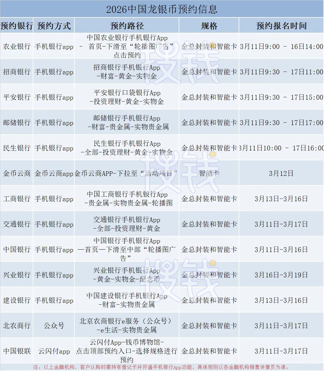 2026版中国龙银币封装纪念版和智能卡昨日日起在多家银行渠道陆续开启预约抽签。目前已开放预约的银行包括农业银行、平安银行、招商银行、邮储银行、民生银行、中国银行、云闪付、北京农商行、交通银行等,预约时间集中在3月11日上午,具体时间各银行略有差异。