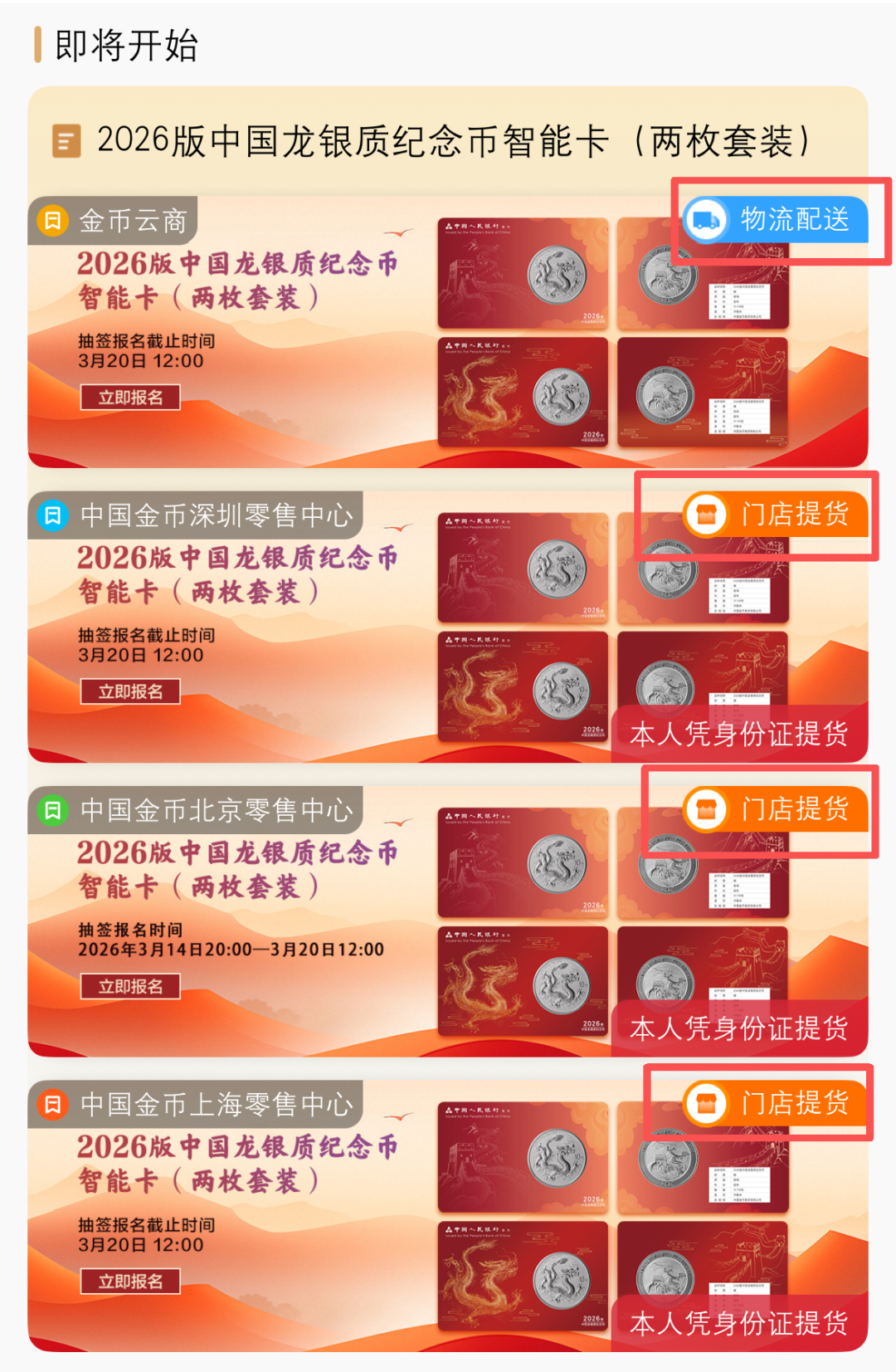 5、中签抵扣货款后,金币云商渠道会为您安排邮寄发货;三家零售中心会发送取货码到您的报名手机号上,须凭本人身份证及带有取货码的手机到对应零售中心自提取货。