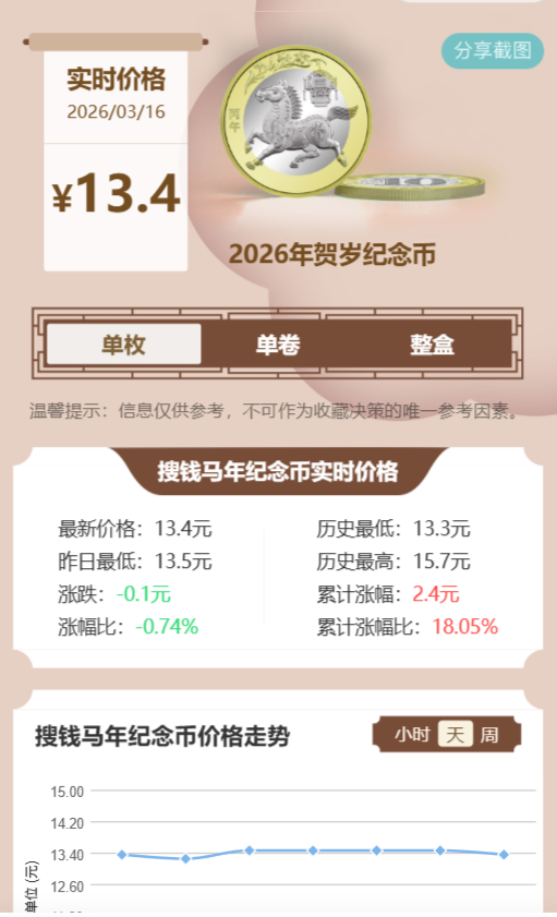 二轮马年纪念币下跌至13.4元左右