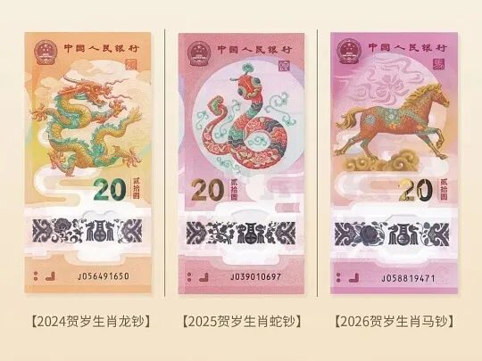 2024 年起正式发行生肖钞,目前已推出龙、蛇、马三款,均为 20 元面值塑料钞,发行量各 1 亿张。