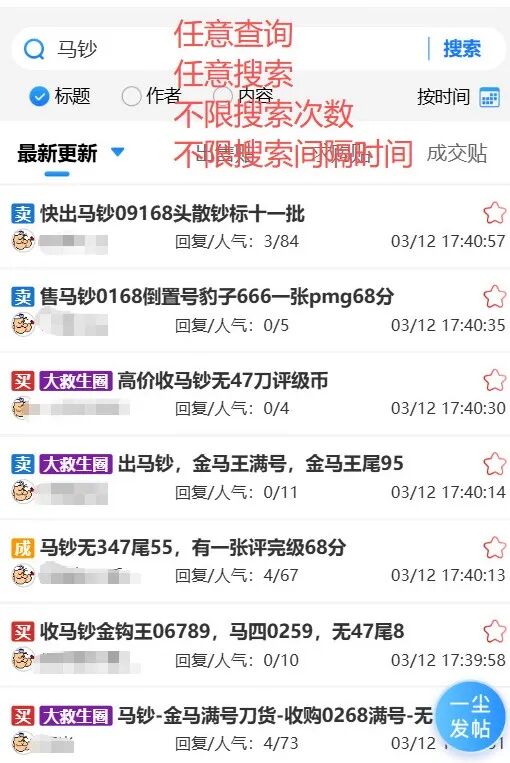 可按出售、求购、成交进行分类搜索,也能通过标题、作者、正文实现全面检索,藏品行情随时掌握。