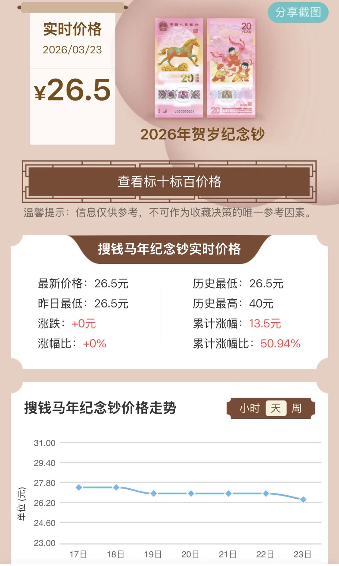 马钞为生肖钞系列第三张,年前最高涨至45元,年后热度降温、资金转移后价格回归理性。目前散张收购价在27至28元,标十收购价约300元,整体成交量尚可。后续还将迎来二次预约兑换,市场供应将进一步增加。
