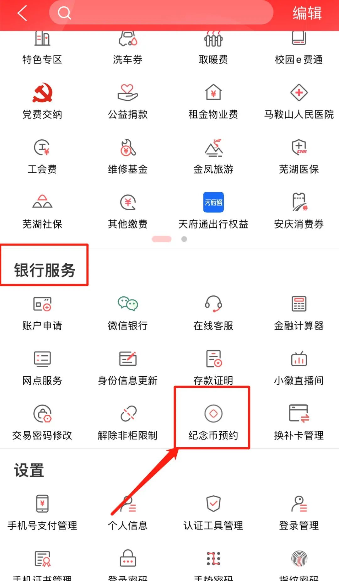 点击首页广告位,进入预约界面。或点击首页 “全部”,—“银行服务” 栏— “纪念币预约”。