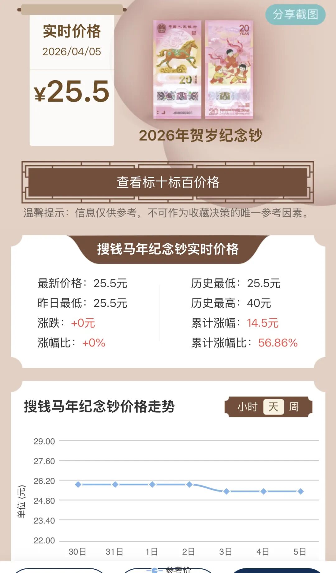 2026年马年纪念钞近期行情持续走低,不挑号散张价格已跌破26元,目前成交价在25至25.5元区间。无4散张约27.5元,无47散张约30元。此前开盘期货价一度冲高至45元,年后跌破30元后继续下探。