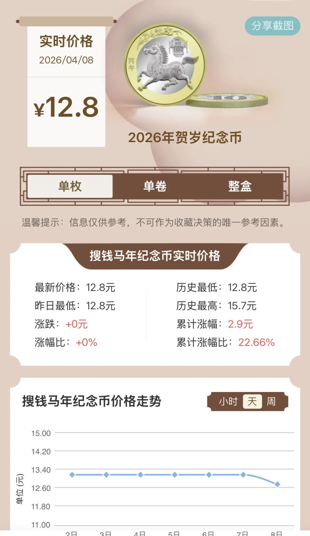 马年纪念币此前最高成交价达15元,即便凭借二轮生肖关门币的市场定位,也未能遏制价格下跌趋势,目前市场成交价已跌至12.8元。
