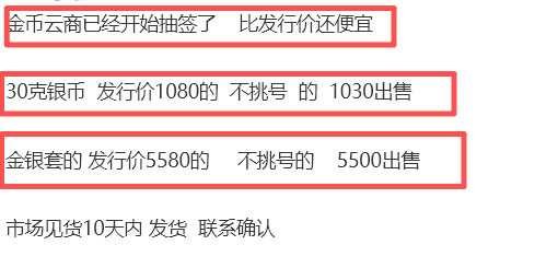 10元30克银币来说,发行价1080元,市场价跌到1030元。金银套币发行价5580元,市场报价也只有5400-5500元。