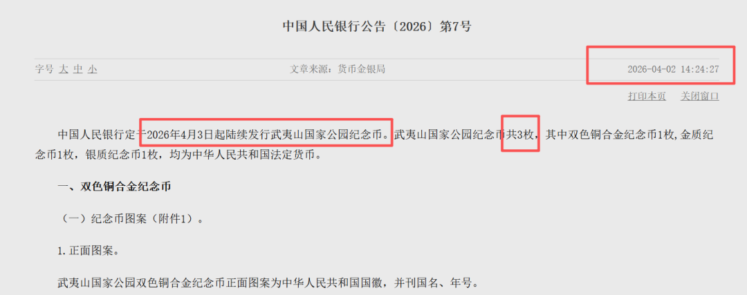4月2日,央行发布最新公告,2026年10元武夷山国家公园纪念币正式发行,线上预约即将启动,每人限约20枚。