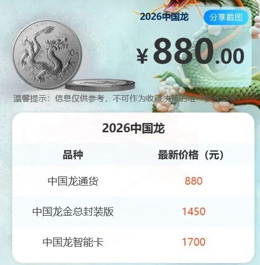 但其他规格表现更弱,智能卡版已经跌破发行价,2026龙银币裸币价格从1400多元腰斩至860-880元上下。