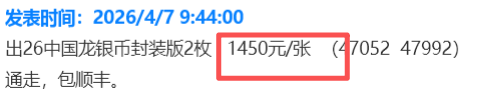 2026版中国龙银币:封装版最高曾被炒至4200元,近期从1260元的低点小幅反弹至1400元左右。